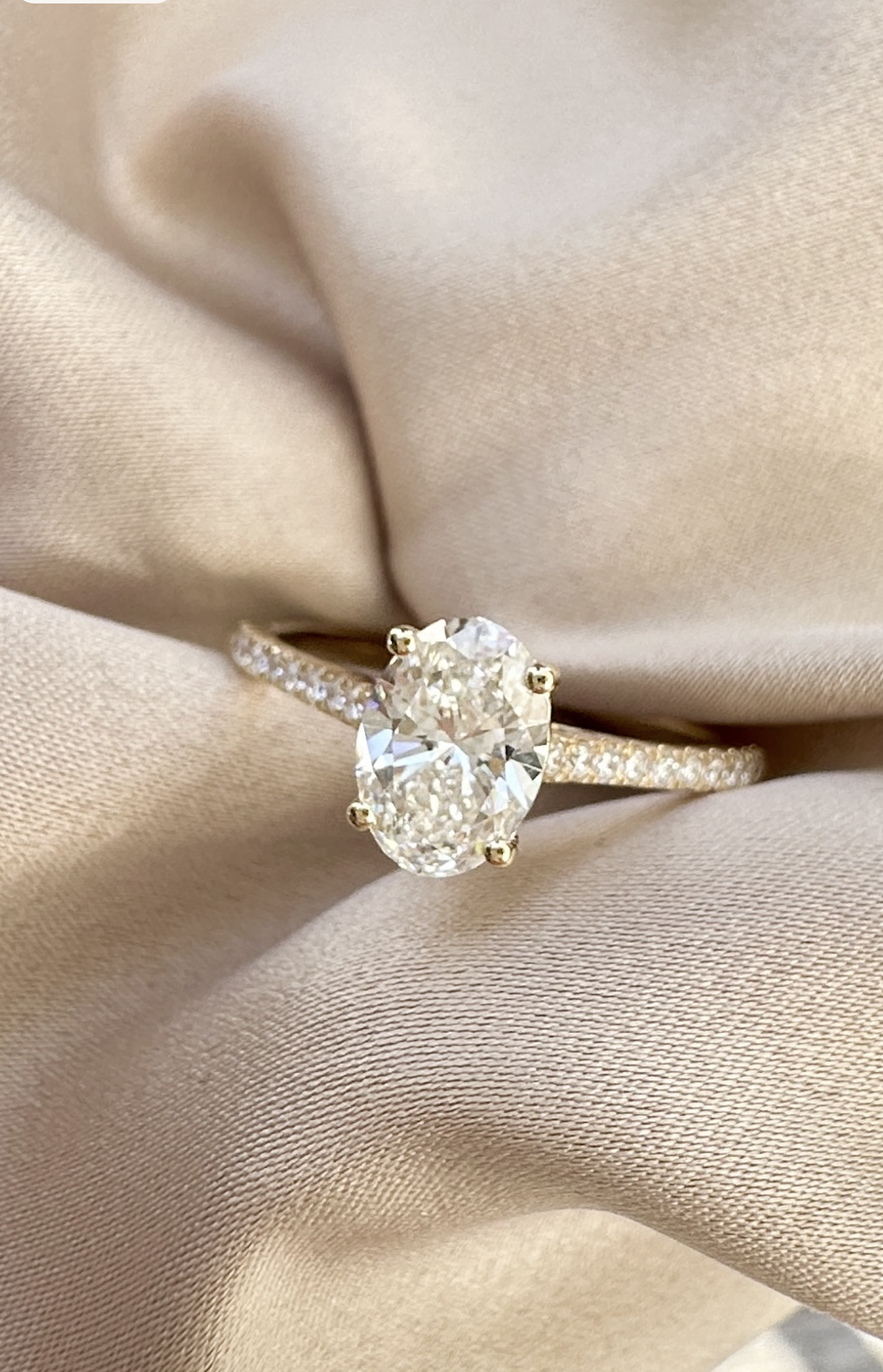 Langs ringskinnen funkler labgrown brillantslebne diamanter elegant og raffineret med pavé-indfattede diamanter, som tilføjer et ekstra lag af gnist og forfining til designet. De små brillanter er præcist placeret for at skabe en harmonisk balance mellem midterdiamanten og ringskinnen, hvilket giver en vidunderlig lysrefleksion.