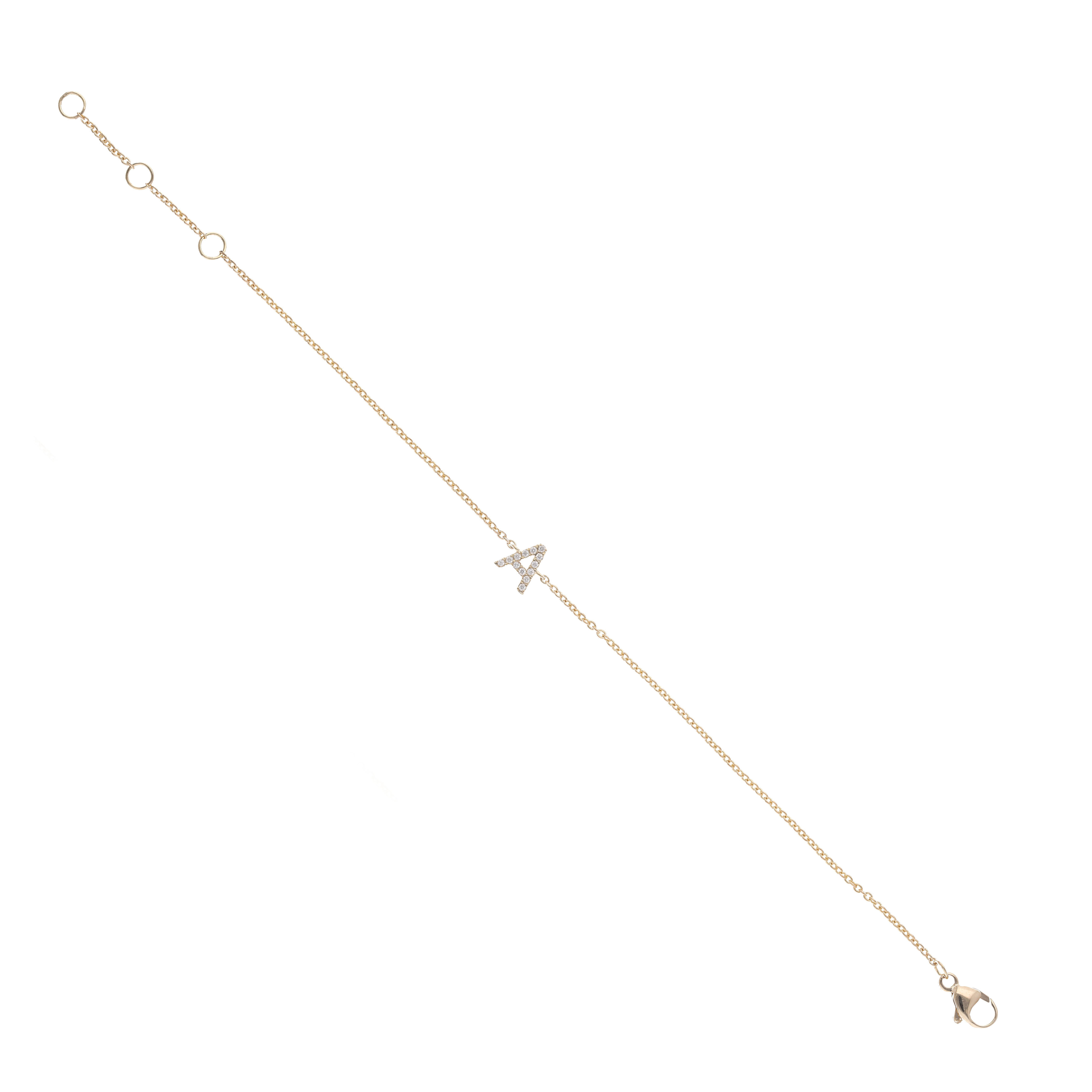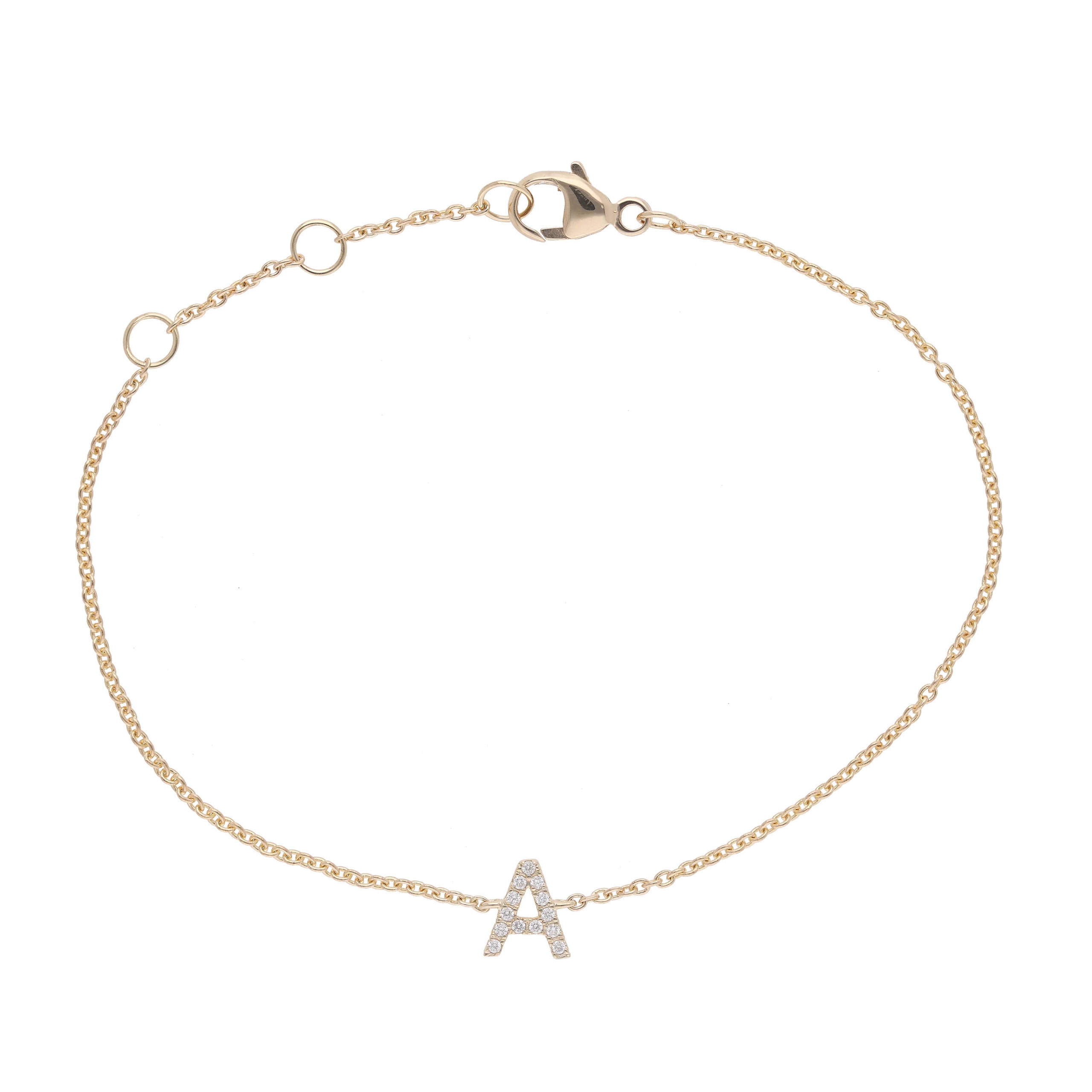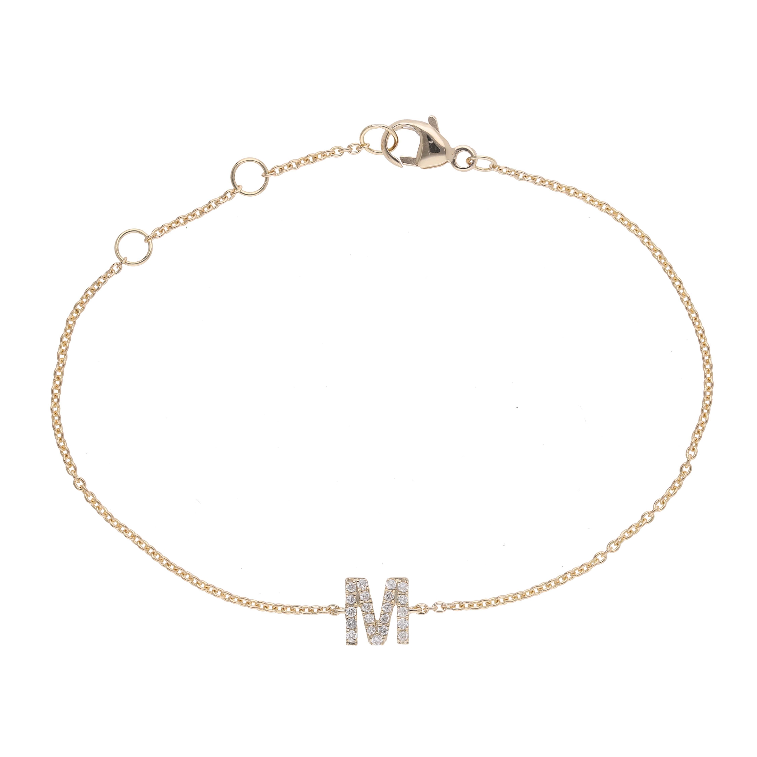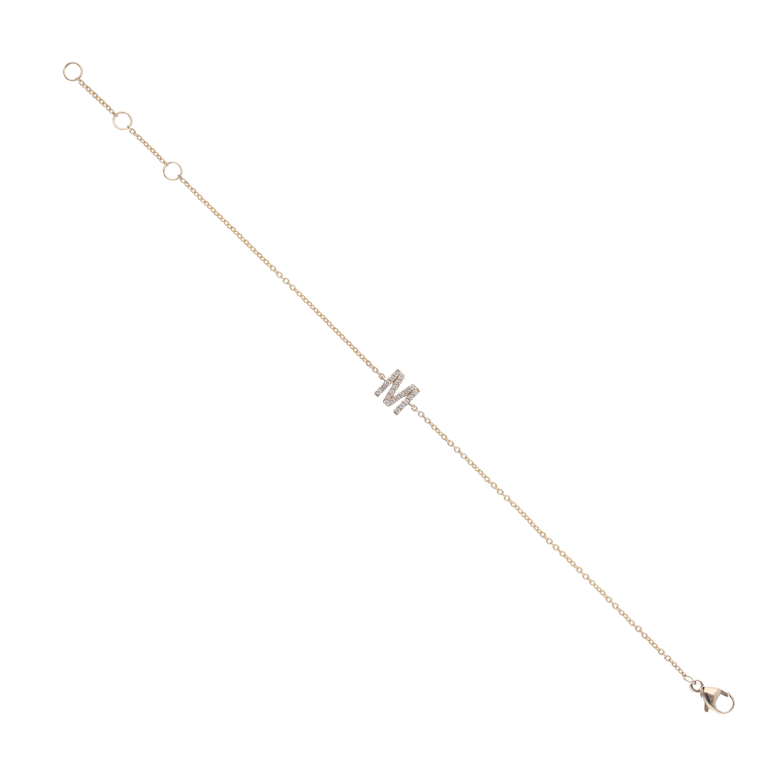 Varenr.: 32566 – Me&My armbånd med mini-bogstav 14 kt guld og fra 0.04 ct. brillantslebne diamanter (afhænger af bogstavet ) Variabel smal og elegant kæde. Kan bæres alene eller sættes sammen med andet for personligt udtryk. Ved bestilling skriv i notarfeltet hvilket bogstav der ønskes.