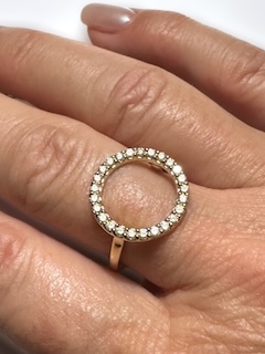 Ringen består af en cirkel med diamanter på i alt ca. 0.50 ct. diamanter. Det åbne design på skinnen, får diamanterne til at glitre fra alle retninger, når de fanger solen og lyset. og giver derved mulighed for meget mere lysrefleksion til diamanterne end traditionel design. Bagsiden er glat, og sætter sig ikke fast i stof eller lign. og indersiden føles glat mod huden. Helt fantastisk Clear Carats design hvor diamanterne rigtig kommer til rette og bliver set.