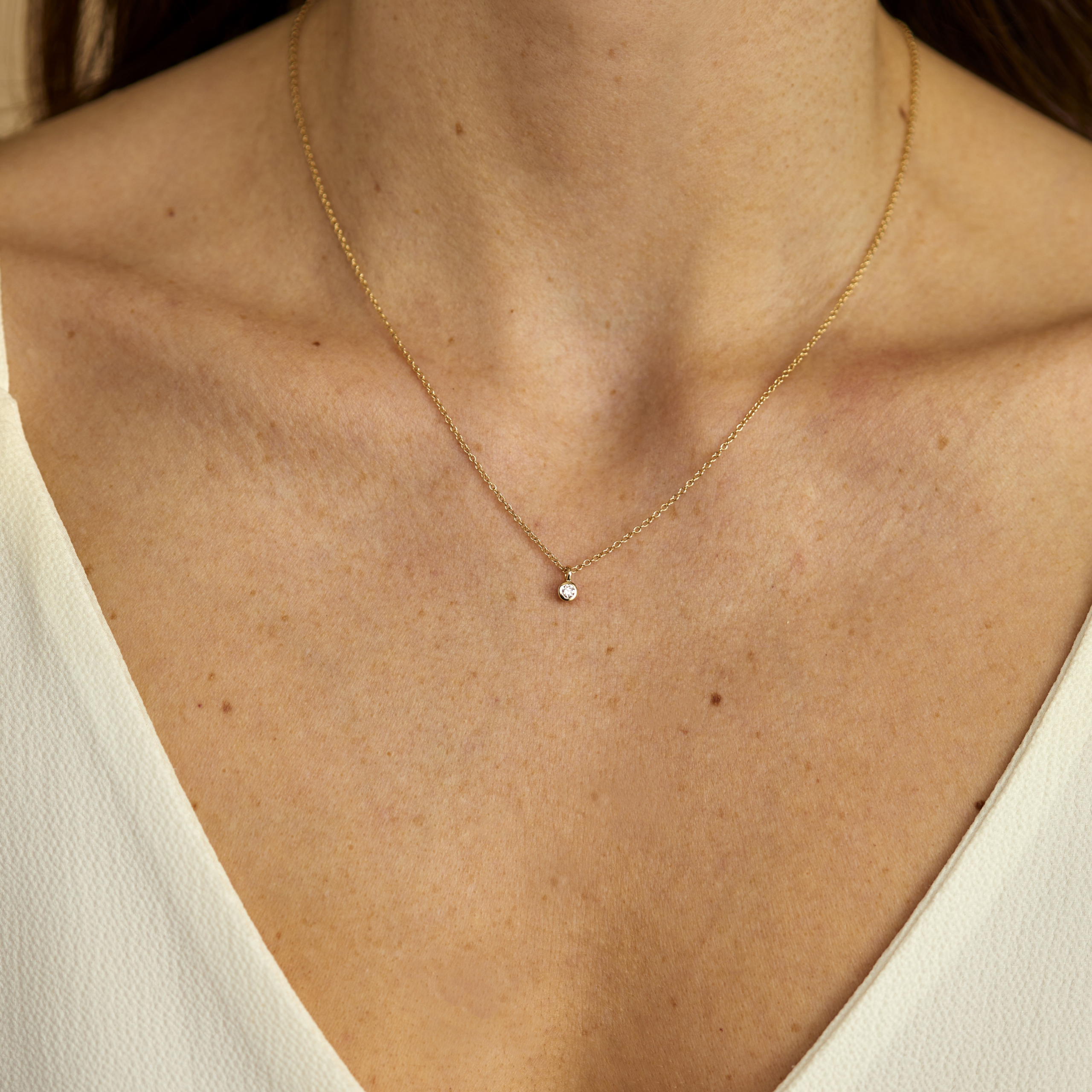 Når det er tanken der tæller og “småt er godt” – og det er det med vores serie “small dots” fra Clear Carats. Her et klassisk og enkelt solitaire vedhæng med 0.08 ct. brillaantsleben labgrown diamant i bezel fatning – Også her har vi designet den så den er lavet med diskret hul på indersiden ved diamanten, som dermed giver mulighed for meget mere lysrefleksion end normalt. Dette får diamanten til at glitre fra alle retninger, når den fanger solen og lyset.