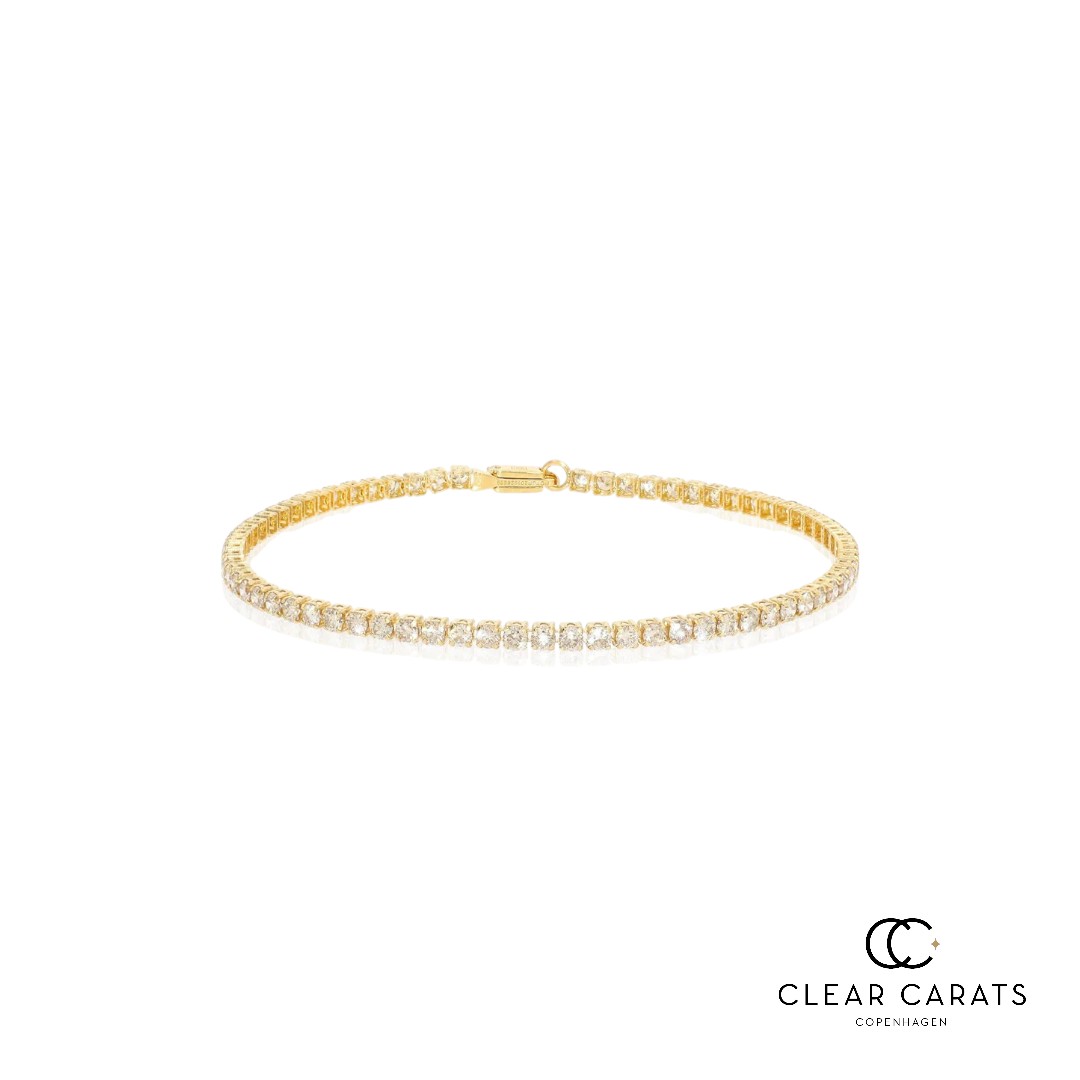 Vores nye elegante tennisarmbånd i 14 kt. ædelmetal og hele 2.8 ct. full-cut brillantslebne lab-grown brillanter. Designet med åbne link for maksimal lysindfald uanset hvordan armbåndet sidder og sikkerhedskrog for maksimal sikkerhed. Perfekt til både hverdag og fest. Den specielle sikkerhedslås er designet som en lille dobbeltkrog. For at lukke armbåndets lås korrekt, skal den lille krog sættes i først, efterfulgt af den større krog. OBS: Videoen viser en 2.8 ct med lab-grown brillantslebne diamanter.