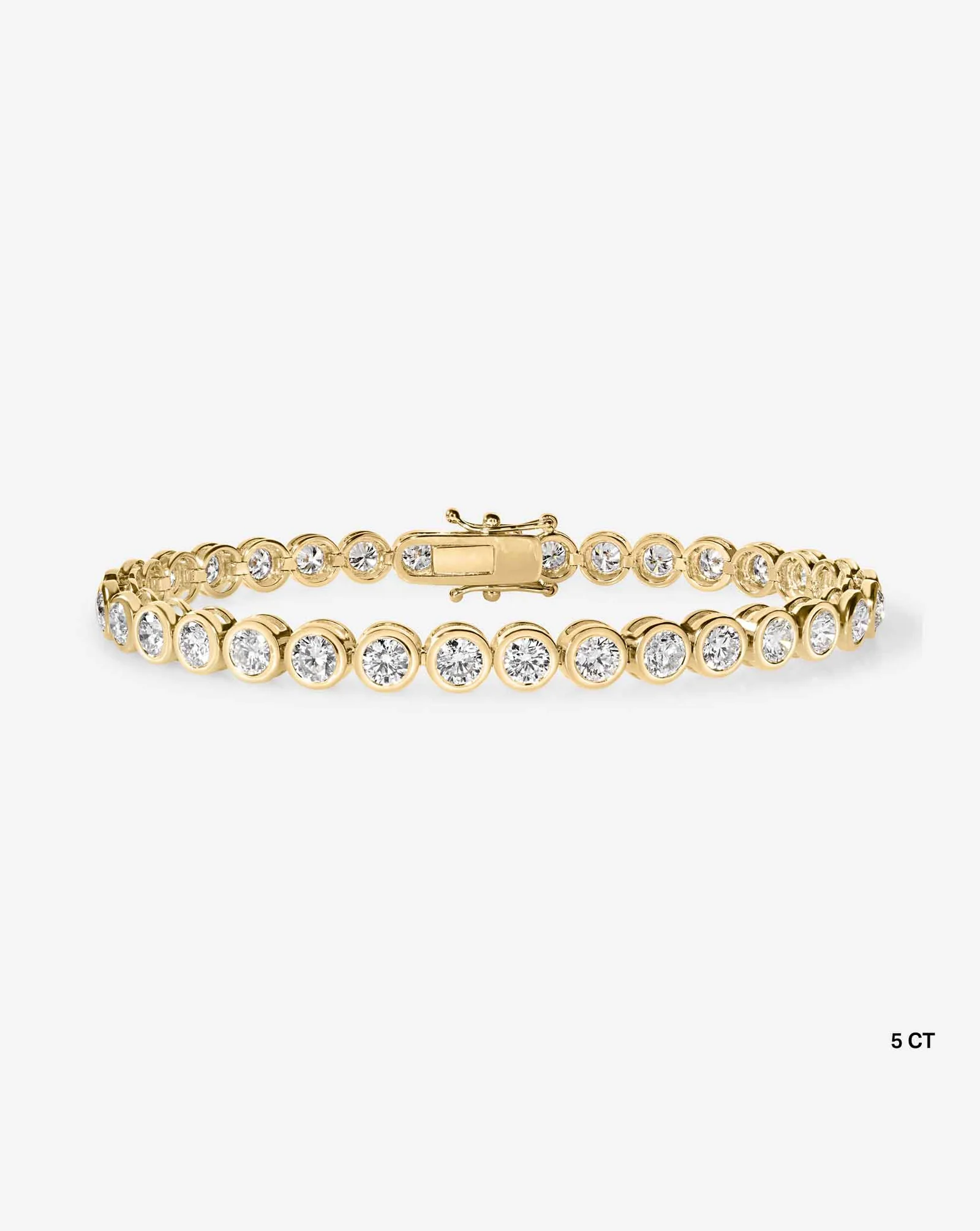Varenr: 32887-4 – Signature tennisarmbånd og lab-grown brillantslebne diamanter i bezel-fatning der beskytter stenene og sikrer maksimal komfort ved daglig brug. Fåes i flere carat. Den har hele 2 stk. sikkerhedshasper samt kasselås. OBS: Billedet viser en 5.0 ct. i massiv 14 kt. guld