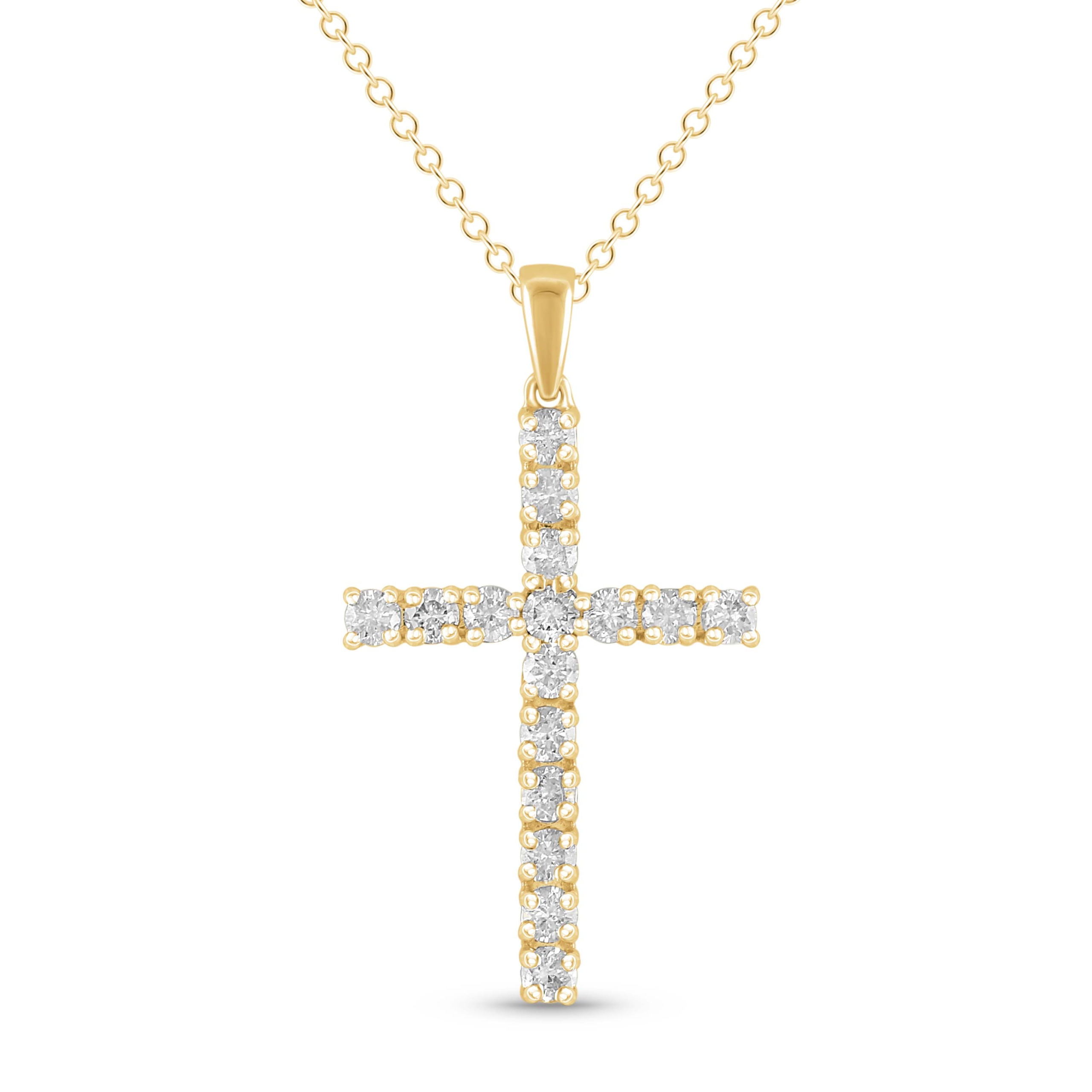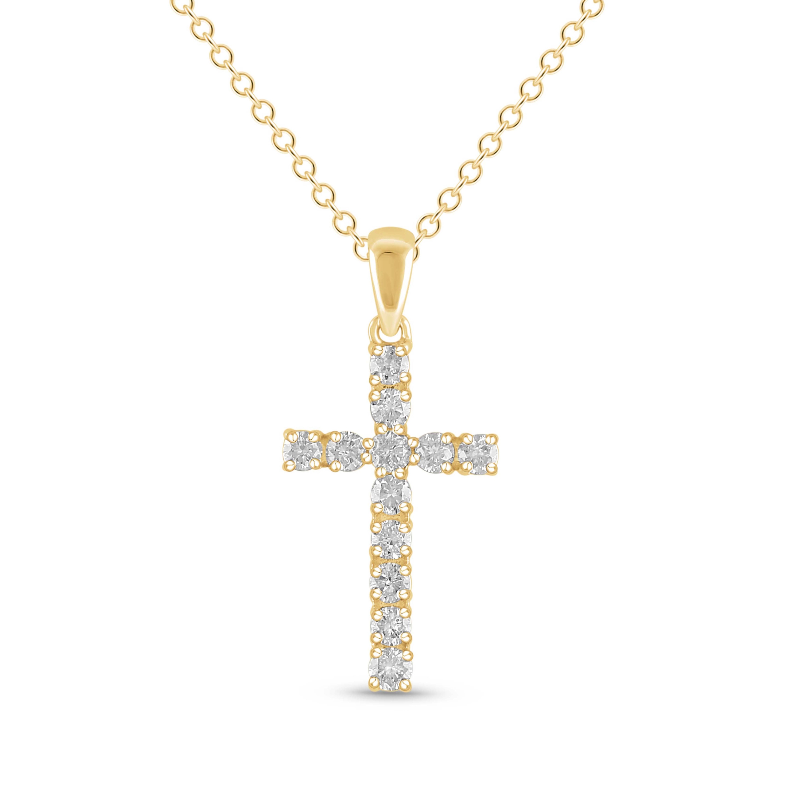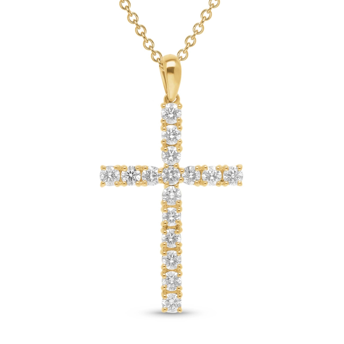 Varenr: 20248P – Kors-vedhæng i 9 kt. guld med strålende pavé-indfattet lab-grown diamanter. Vælg mellem str. XS – L. Et kors med diamant er mere end blot et smykke; det er et symbol på tro, håb og kærlighed. Det gør det til den perfekte gave til livets store mærkedage: Billedet viser i str. L