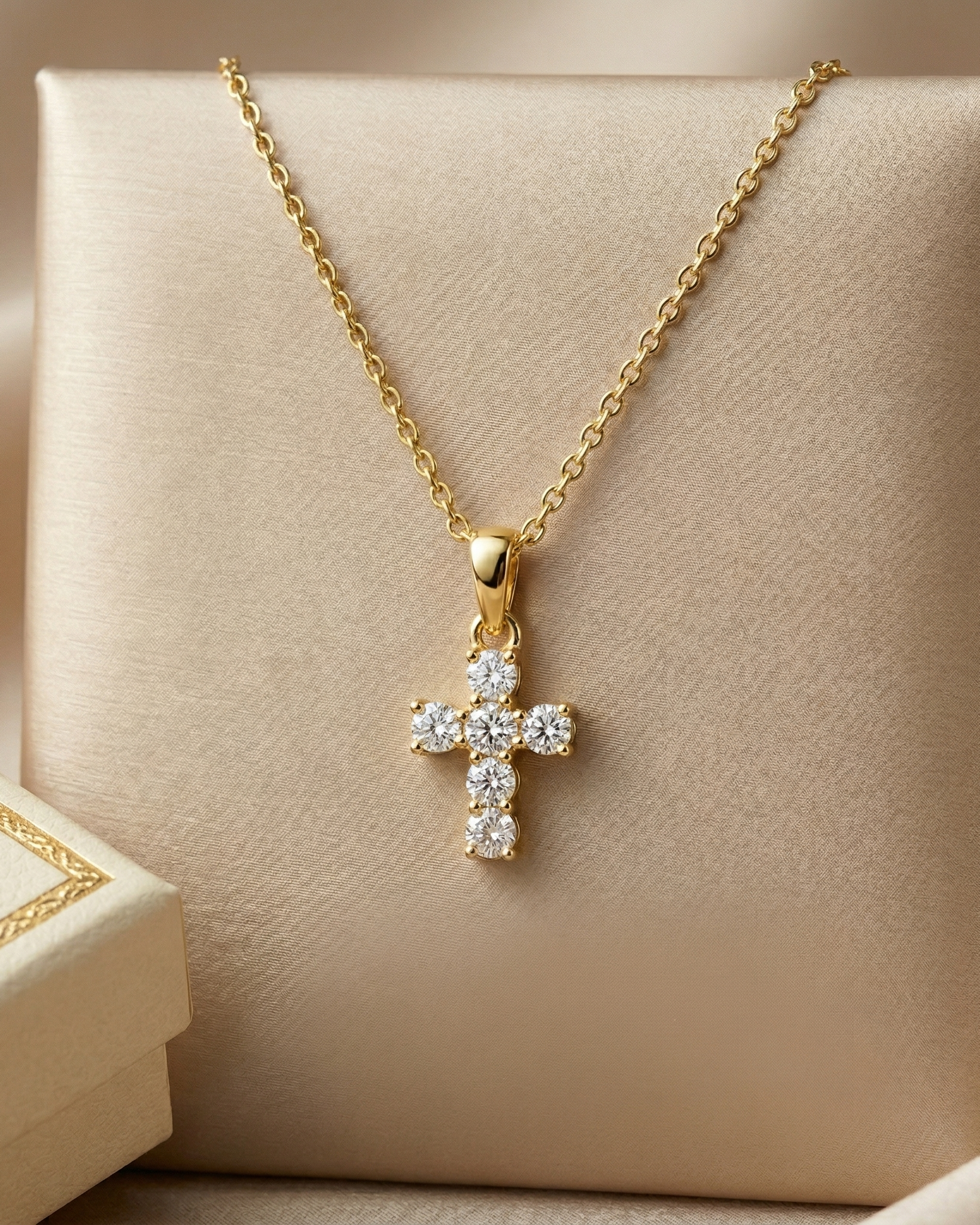Giv dit look et strejf af klassisk skønhed og personlig betydning med dette eksklusive kors-vedhæng. Dette smykke forener det traditionelle symbol med et moderne, luksuriøst udtryk, der gør det velegnet til både hverdag og festlige lejligheder.