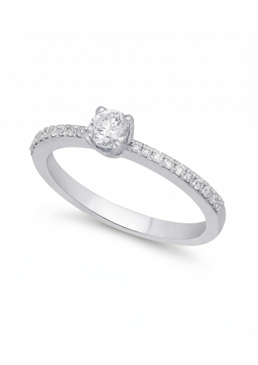 Varenr: 36551 – Bella Solitairering i 14 kt guld med 0.20 ct. centersten flankeret af 0.15 ct. diamanter langs ringskinnen – Total på hele 0.35 ct brillantslebne diamanter der fattet i hvidgulds rhodinering. Perfekt til forlovelse eller vielsesring.