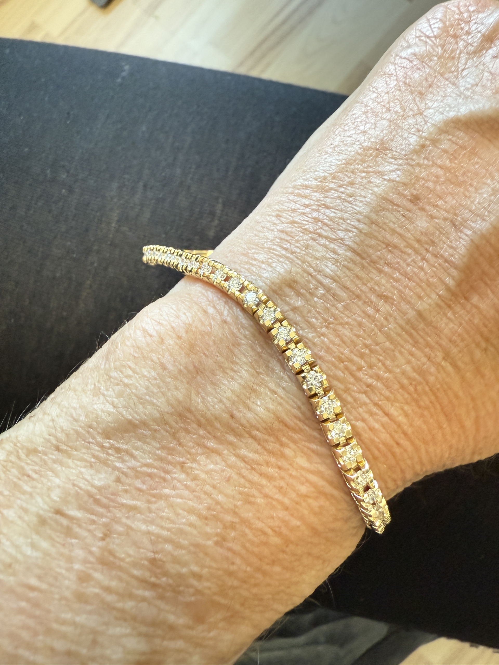 Tennisarmbånd i 14 kt. guld med de smukkeste, funklende brillantslebne diamanter på i alt 3.00 ct. fattet hele vejen rundt i kassefatning. Vores klassiske tennisarmbånd er designet så diamanterne er omfattet af 4 elegante grapper hvilket er den klassiske fatning for tennisarmbånd, samt er der lavet diskrete huller på indersiden og ydersiden ved diamanterne, som dermed giver mulighed for meget mere lysrefleksion til diamanterne end normalt.